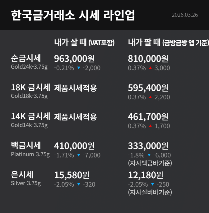 목록 페이지 정보 작성자 최고관리자 작성일26-03-26 11:50 3월 26일 금시세 입니다 본문 성투하세요! 이전글3월 27일 금시세 입니다 26.03.27 다음글3월 24일 금시세 입니다 26.03.24